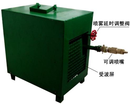 本裝置設計為一體化,有進水閥門、噴霧時間調整閥門等組成,當迎頭放炮時震動沖擊波沖擊機械放炮噴霧裝置的受波屏,進水閥門打開,開始噴霧,同時水源又給進水延時水箱注水,由于延時水箱與所配墜鐵比重偏移,水箱的水滿后,水箱逐漸傾斜并緩慢放水,從而逐漸減少噴霧延時時間,水箱的水流盡后,噴霧停止,直至下一次放炮,再次循環(huán)實現噴霧過程。噴霧延時水箱有進水調整閥門,調整此閥門可調整噴霧時間。